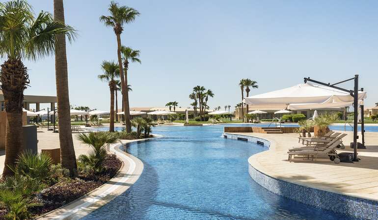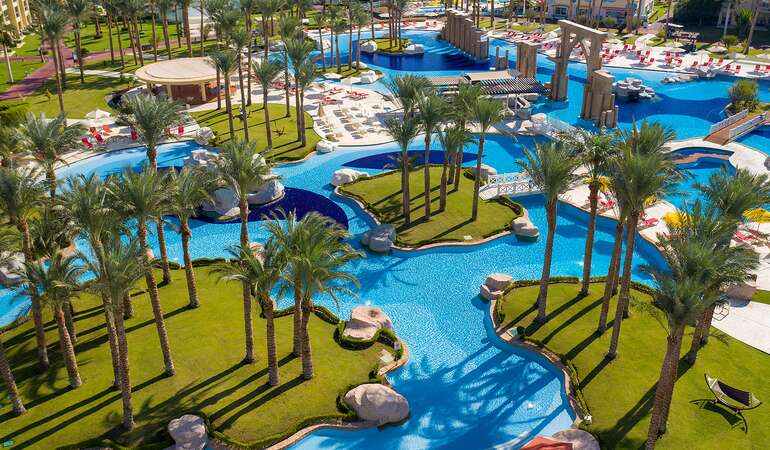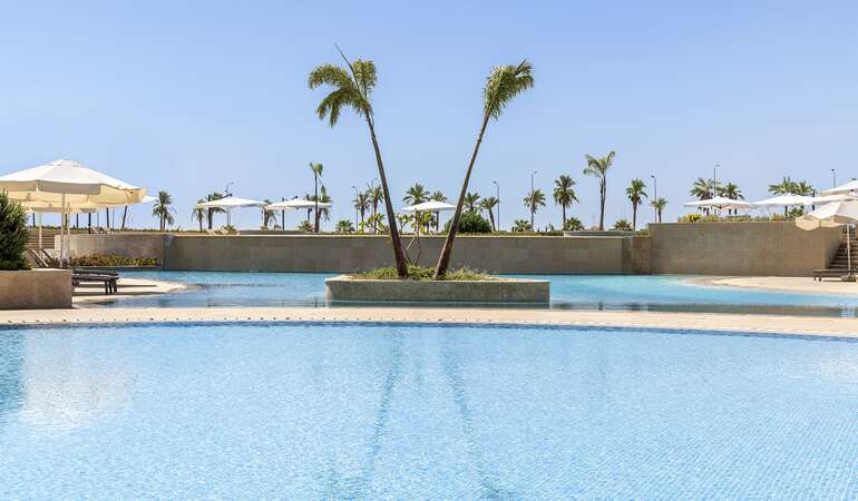 • Langstrakt hotellområde med flere basseng